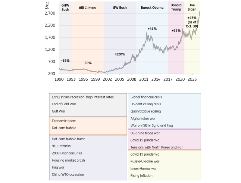 ING关键图表回顾1989-2024年影响金价的美国总统任期和关键事件: