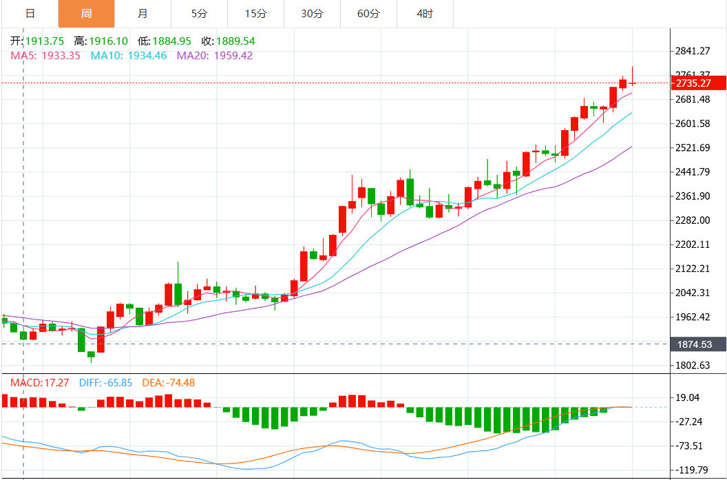 在本周的交易中,黄金价格波动剧烈,周四一度创下每盎司2,790.15美元的历史新高,之后因获利了结和美元走强小幅下跌。截至周五,现货黄金报2,736.28美元,下降了0.2%,而美国期金则基本持稳于2,749.2美元附近。本周的高点不仅标志了投资者对黄金的信心,同时也反映出避险需求的不断增加。