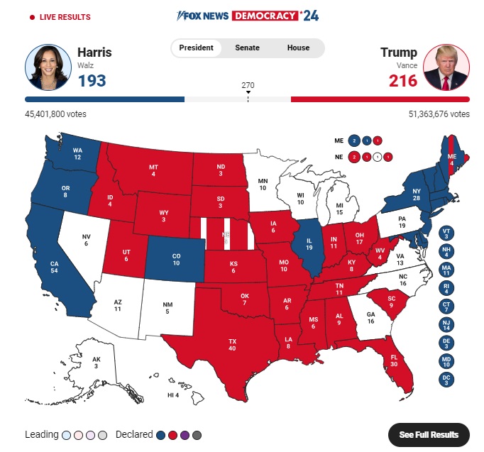 据美国福克斯新闻实时开票显示,截至目前,美国共和党总统候选人特朗普获得216张选举人票,民主党总统候选人哈里斯赢得193张选举人票。