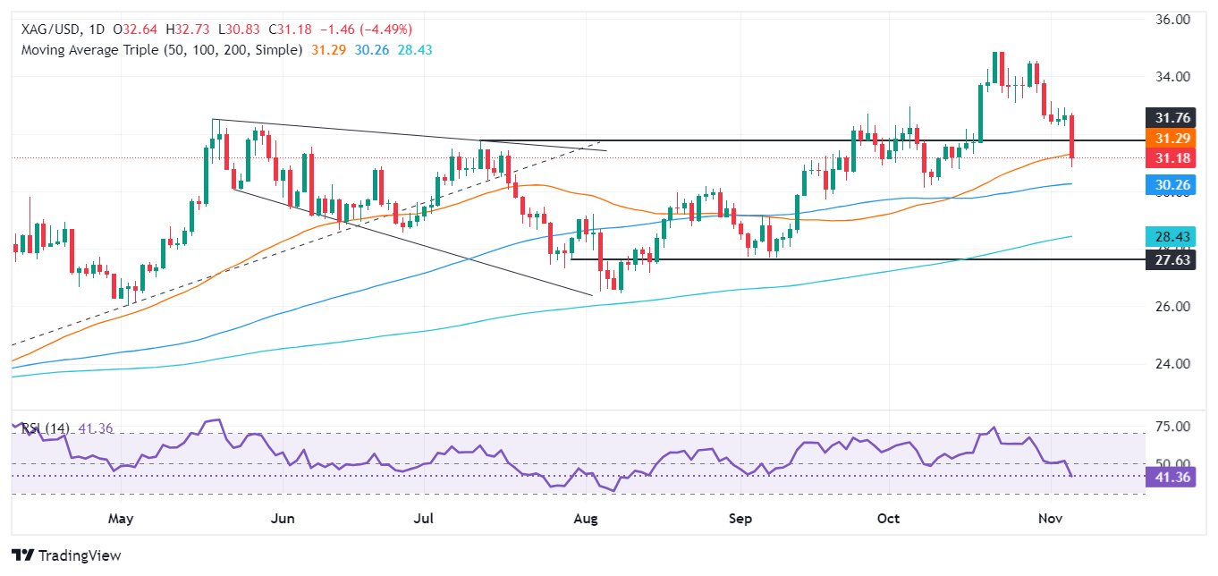 Valencia指出,特朗普的胜利提振美元,白银价格周三跌破关键支撑位,包括50日移动平均线31.27美元/盎司,这为触及日低点30.84美元/盎司打开大门。