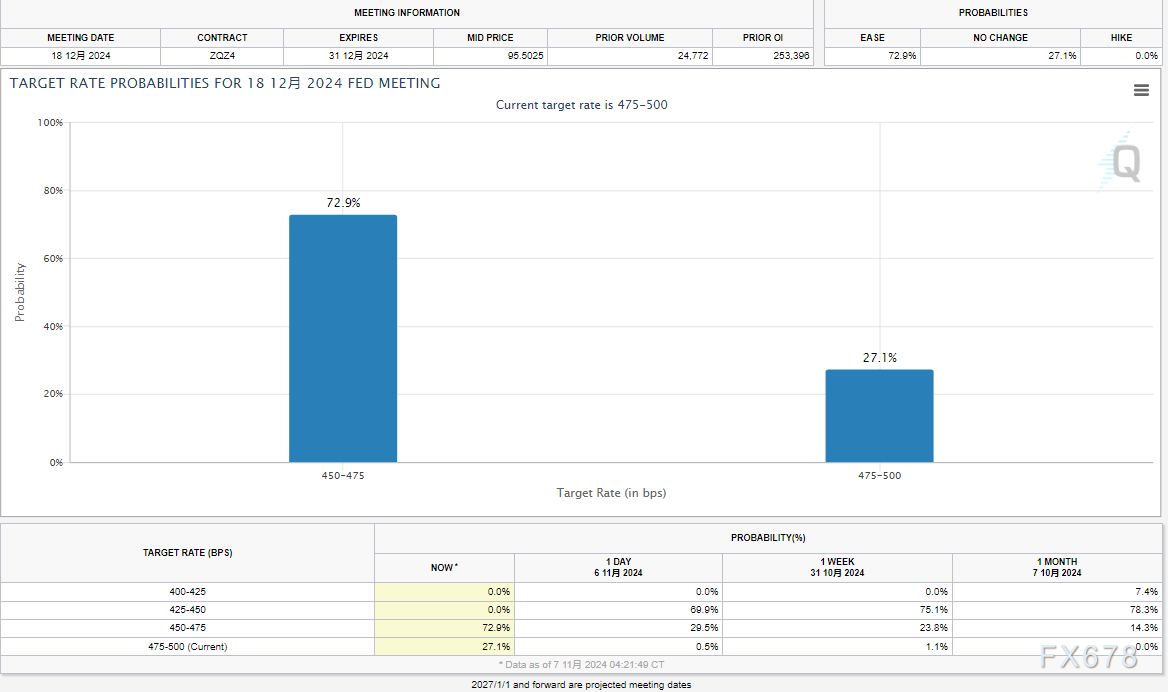 据CME“美联储观察”:美联储到12月维持当前利率不变的概率为27.1%,累计降息25个基点的概率为72.9%(前一天为67%)。到明年1月维持当前利率不变的概率为15.8%,累计降息25个基点的概率为53.8%,累计降息50个基点的概率为30.4%。