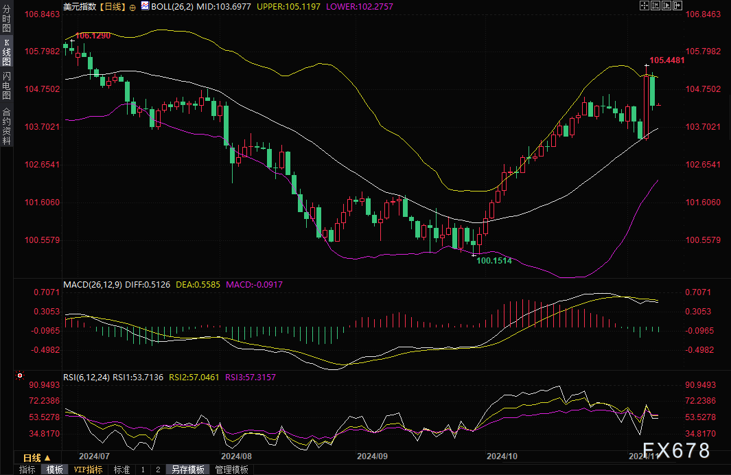 美元指数纽约尾盘下跌 0.67%,至 104.38。周三,由于投资者消化了特朗普的政策,美元指数触及四个月高点 105.45。