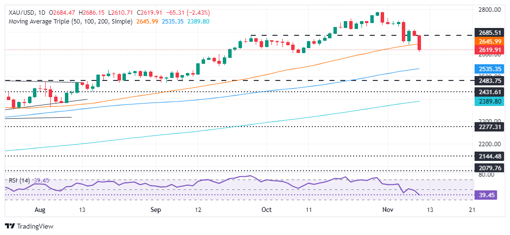 FXStreet分析师Christian Borjon Valencia指出,金价周一盘中一度崩跌至2610美元/盎司左右,有可能跌破10月10日低点2603美元/盎司的最新短期支撑位。若失守该支撑位,这可能为金价进一步下行铺平道路。在这种情况下,金价下一个支撑位将是2600美元/盎司,随后是100日简单移动平均线(SMA)2534美元/盎司。