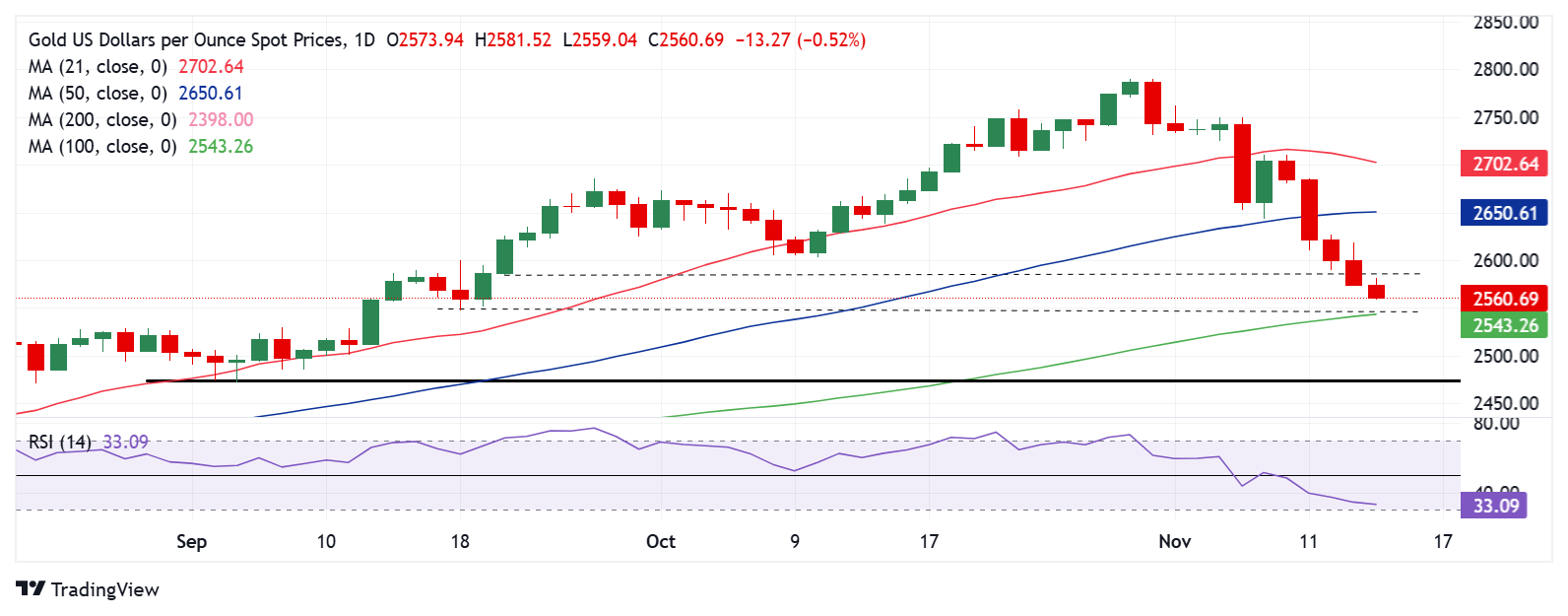 24K99讯 周四(11月14日)欧市早盘,现货黄金维持日内大跌走势,目前金价位于2556美元/盎司附近,日内重挫约17美元。FXStreet高级分析师Dhwani Mehta周四最新撰文,对金价技术走势进行分析。