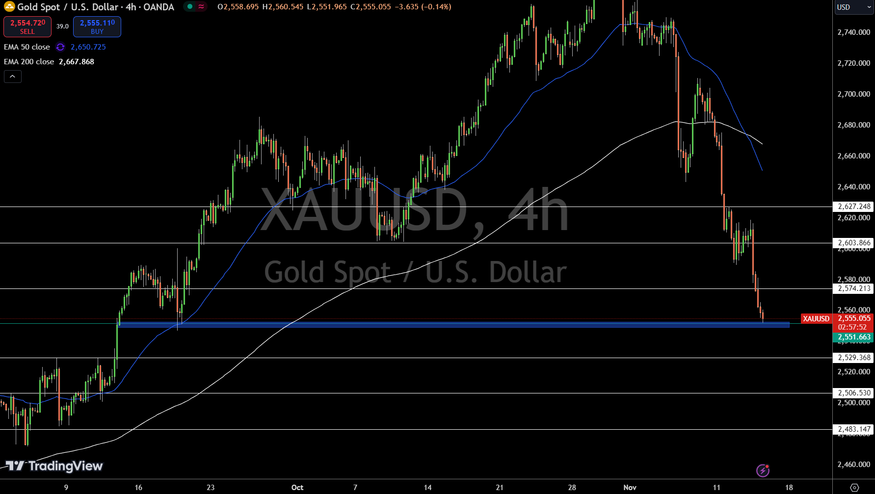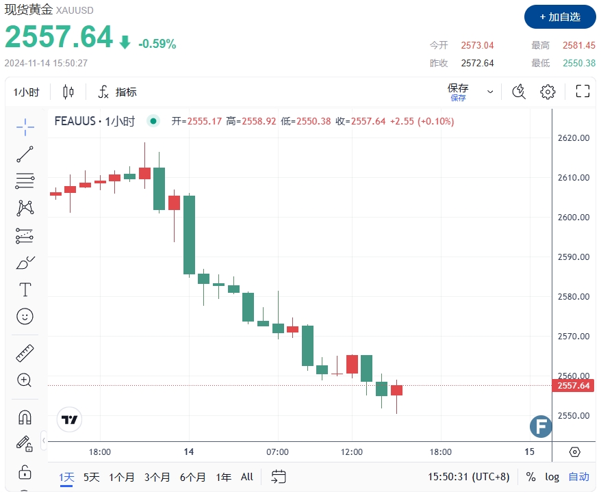 24K99讯 周四(11月14日)亚市尾盘,黄金价格跌深触及2550美元,达到自9月中旬以来的最低水平,随后微幅反弹。此次下跌的主要推动力是美元近期走强,而市场对当选总统特朗普(Donald Trump)将推出促进增长的政策的预期推动了这一走势。