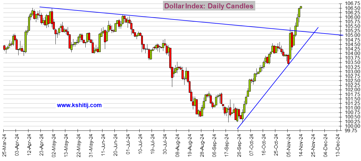 FX168财经报社(亚太)讯 周四(11月14日)亚市盘中,美元指数维持日内涨势,刚刚升至106.71,创一年新高;现货黄金维持日内跌势,目前交投在2564美元/盎司附近。投资者接下来将关注美国PPI数据和美联储主席鲍威尔讲话。Kshitij咨询服务团队(Kshitij Consultancy Service)周四最新撰文,对美元指数、欧元/美元、欧元/日元、美元/日元、澳元/美元、英镑/美元以及美元/人民币后市走势进行前瞻分析。