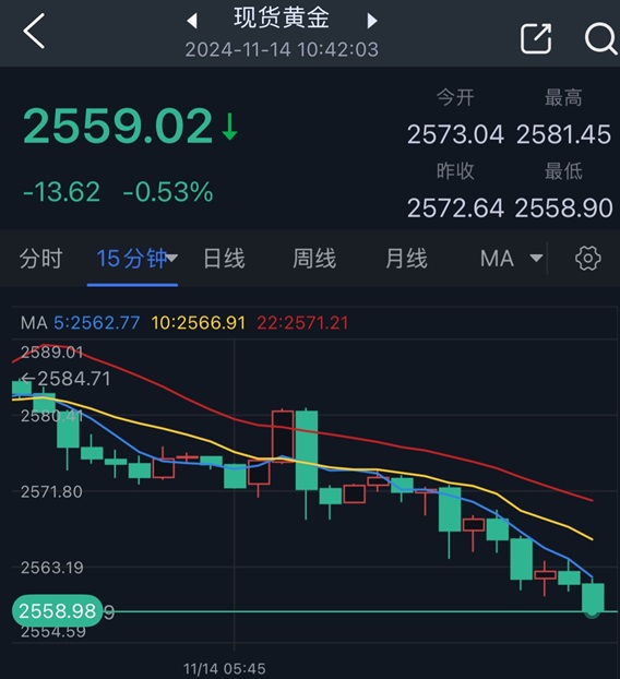 北京时间10:42,现货黄金报2559.02美元/盎司。