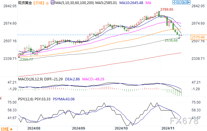 他指出:“11月13日周三,黄金决定性地跌破了关键的中期支撑区间2600美元/ 2590美元。本周早些时候,也就是11月11日周一,金价跌破了自7月3日以来四个月来维持其价格走势的50天移动均线,这表明金价的中期上行趋势阶段已被破坏。”