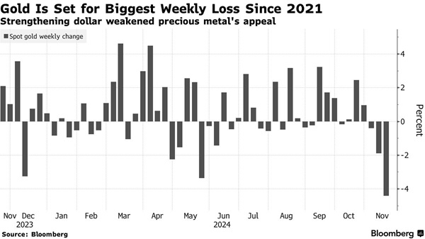 金价已从10月31日的历史高点下跌约8%,在特朗普上周赢得大选后,跌势进一步加剧。美元指数飙升,原因是人们预期,在特朗普担任总统期间,经济增长和企业利润将会走高。美元走强使得以美元计价的大宗商品对大多数买家来说更加昂贵。