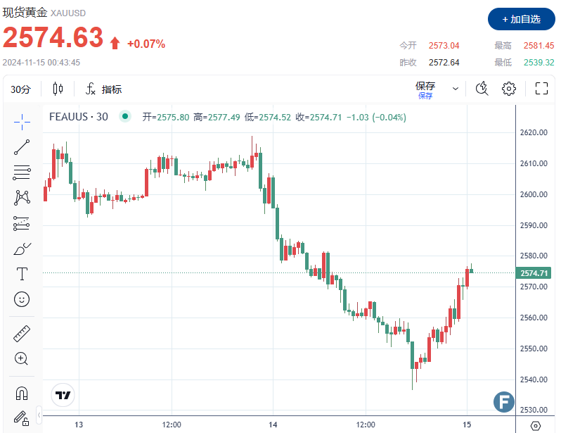 周四(11月14日),受美元强势上涨的压力,金价一度跌至两个月来的最低点,不过,在最新的美国经济数据公布后,交易商并未对美联储 12 月份降息失去信心,金价强势反弹。
