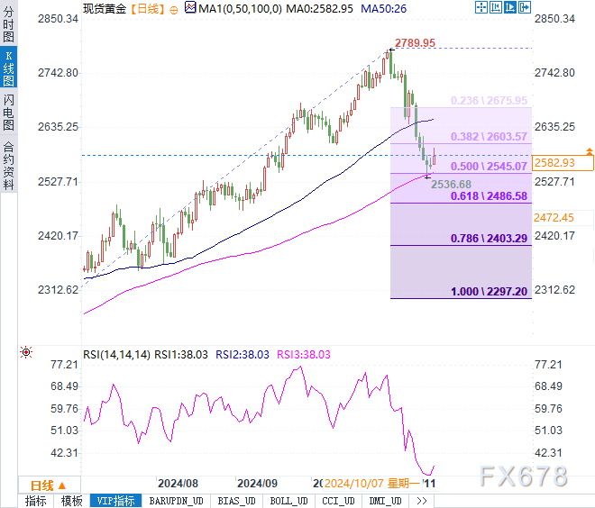 近期金价从历史高点回落后在2535美元区域找到支撑,该区域与6月至10月涨势的50%回调位和100日均线重合,成为短期的技术性关键位。以下为短期技术观察:
