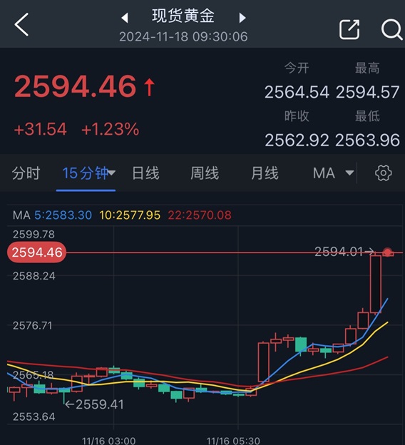 24K99讯 周一(11月18日)亚市盘中,现货黄金短线突然大幅上涨,金价目前逼近2595美元/盎司,日内飙升逾30美元。分析人士指出,地缘政治风险可能推高作为传统避险资产的黄金价格。