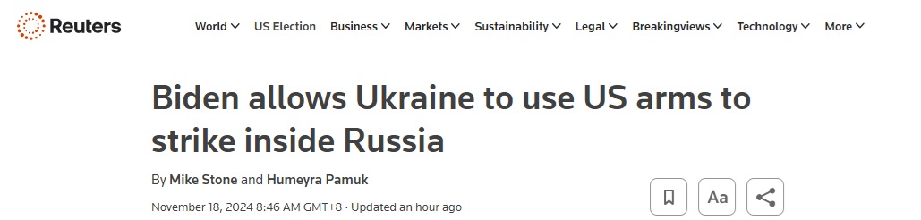 据英国路透社11月17日报道,美国总统拜登(Joe Biden)的政府允许乌克兰使用美制武器袭击俄罗斯纵深地区,这是华盛顿在乌克兰和俄罗斯冲突中的政策发生重大逆转。
