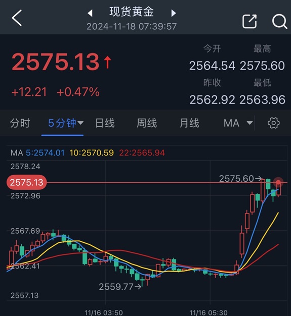 北京时间07:39,现货黄金报2575.13美元/盎司。