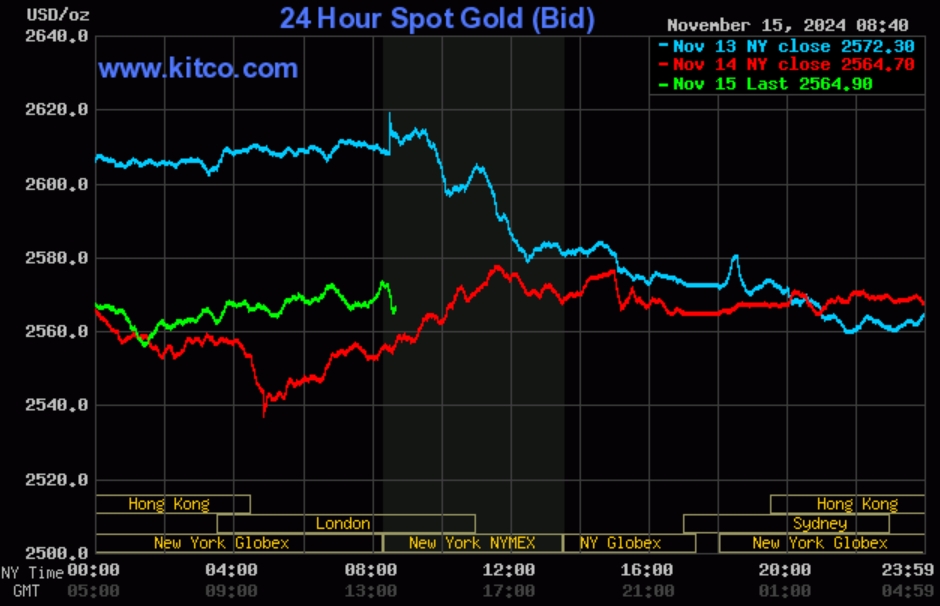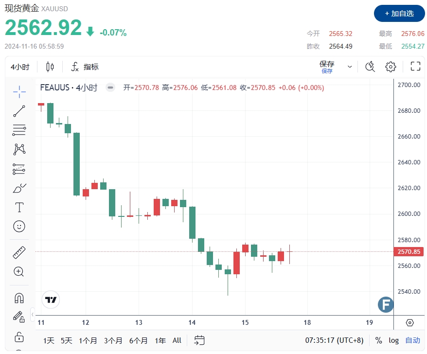 24K99讯 黄金本周收盘落至2562美元,从周初高点2685美元一路下探。“特朗普交易”(Trump Trade)联手美国消费者物价指数(CPI)、生产者价格指数(PPI)、“恐怖数据”零售销售爆表,提振了美元指数强势上扬,并压制贵金属买盘。美联储主席鲍威尔释出明确的鹰派信号,表示在美国经济数据强劲下,该行不急于降息。金价调查显示,华尔街再次只有少数人认为黄金在短期内有上涨潜力。