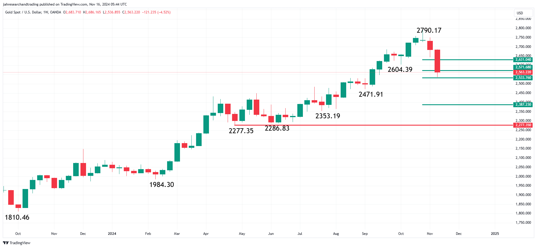 从技术角度来看,黄金本周收盘价略高于2533.76美元,保持这一关键支撑位。如果未能守住这一支撑位,则可能导致金价加速下跌至50%回撤位2387.23美元。阻力位在2571.68美元和2631.04美元,上周最高价为2686.17美元,最低价为2536.85美元。