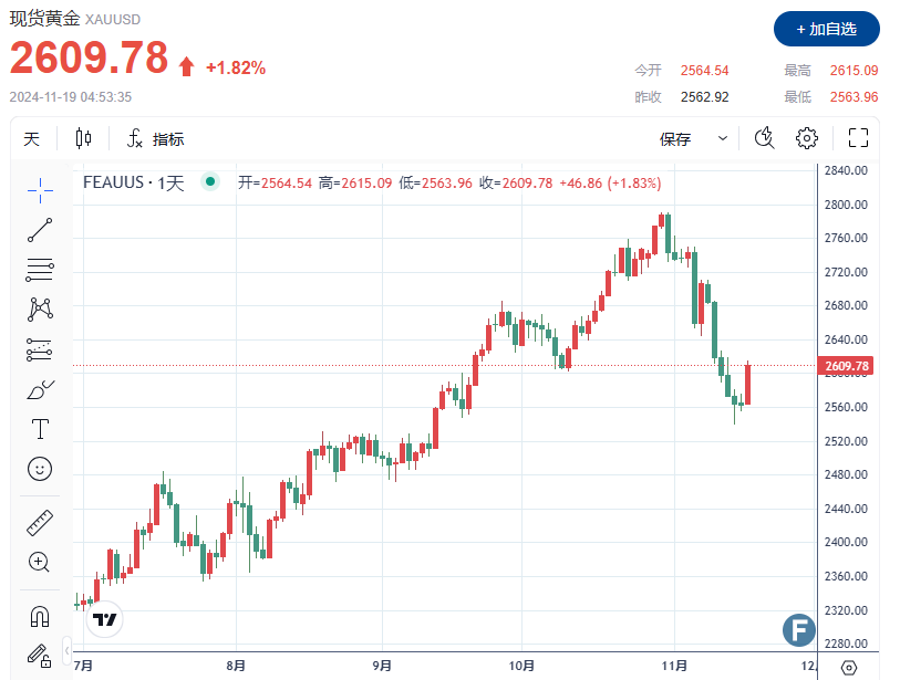 截至发稿,现货金上涨 1.82% 至 2,609.78 美元/盎司,摆脱周四的两个月低点。盘中一度上涨至2615.09美元,较日内低点拉升超50美元。