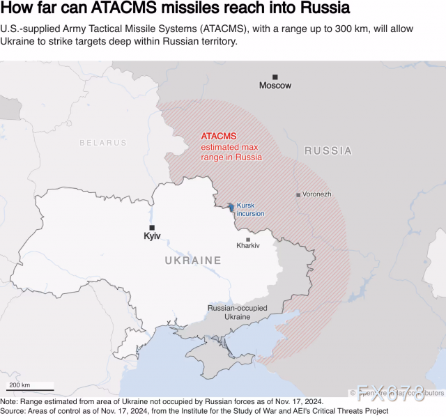 俄罗斯数月来一直警告西方,如果华盛顿允许乌克兰向俄罗斯境内发射美国、英国和法国的导弹,莫斯科将认为这些北约成员国直接参与了乌克兰战争。