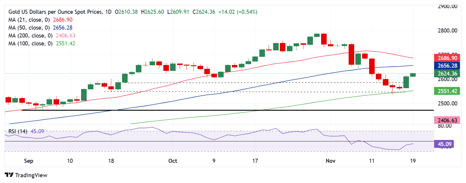 24K99讯 周二(11月19日)欧市早盘,现货黄金维持日内反弹走势,目前金价位于2620美元/盎司附近。FXStreet高级分析师Dhwani Mehta周二撰文,对金价技术走势进行分析。