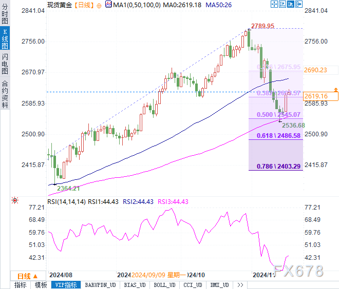 在技术面上,黄金价格自上周跌破100日简单移动均线(SMA)后迅速企稳,并反弹突破了23.6%斐波那契回撤位(对应于历史高点以来的回调走势),目前守稳2600美元水平。技术指标显示,金价尽管短期有反弹动力,但上行空间可能受到2634-2635美元区间的强阻力压制,这一位置同时也是38.2%斐波那契回撤水平所在。