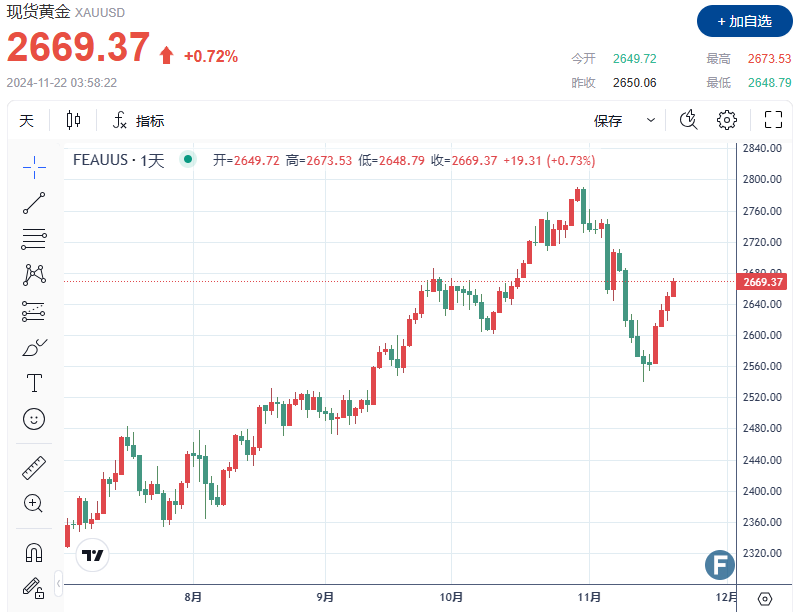 截至发稿,现货金上涨 0.72%,至 2,669.37 美元/盎司。