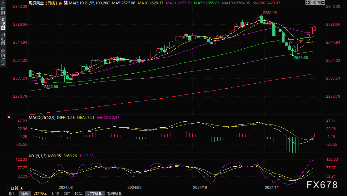 周一(11月25日)亚市盘初,金价一度低开至2693.06美元/盎司,因以色列媒体称以方已原则上同意以黎停火协议草案,而且特朗普竞选承诺的加税可望力度缓和,不过俄乌地缘局势依然紧张,美元更是大跌0.56%,回吐了上周五全部跌幅,这帮助金价快速扭转跌势,一度上涨0.3%至2721.21美元/盎司,为11月6日以来新高。