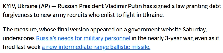 美联社(AP News)报道,普京签署了一项法律,免除在乌克兰参战的新军人的债务。该法案的最终版本于周六发布在政府网站上,强调了俄罗斯在近三年的战争中对军事人员的需求。