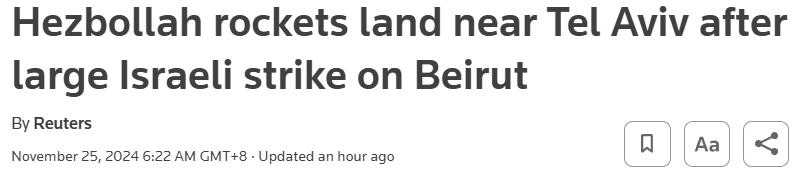 路透社报道,黎巴嫩真主党运动于周日向以色列发射了重型火箭弹,以色列军方称,特拉维夫附近的房屋被毁或被烧毁。前一天,以色列发动的强大空袭在贝鲁特造成至少29人死亡。