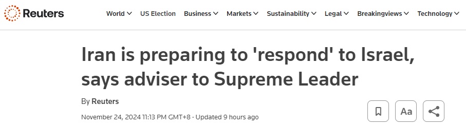 中东局势也传来最新消息。英国路透社周日(11月24日)报道称,伊朗最高领袖的高级顾问Ali Larijani周日接受采访时说,伊朗正在准备“回应”以色列。