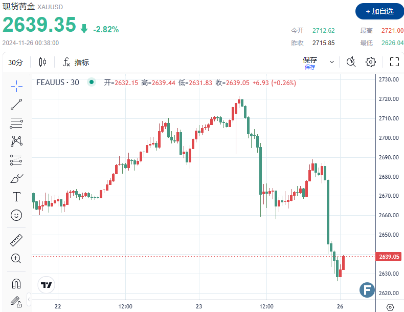 截至发稿,现货金下跌近 3% 至 2,639.35 美元/盎司,创下自 11 月 6 日以来的最大单日百分比跌幅。