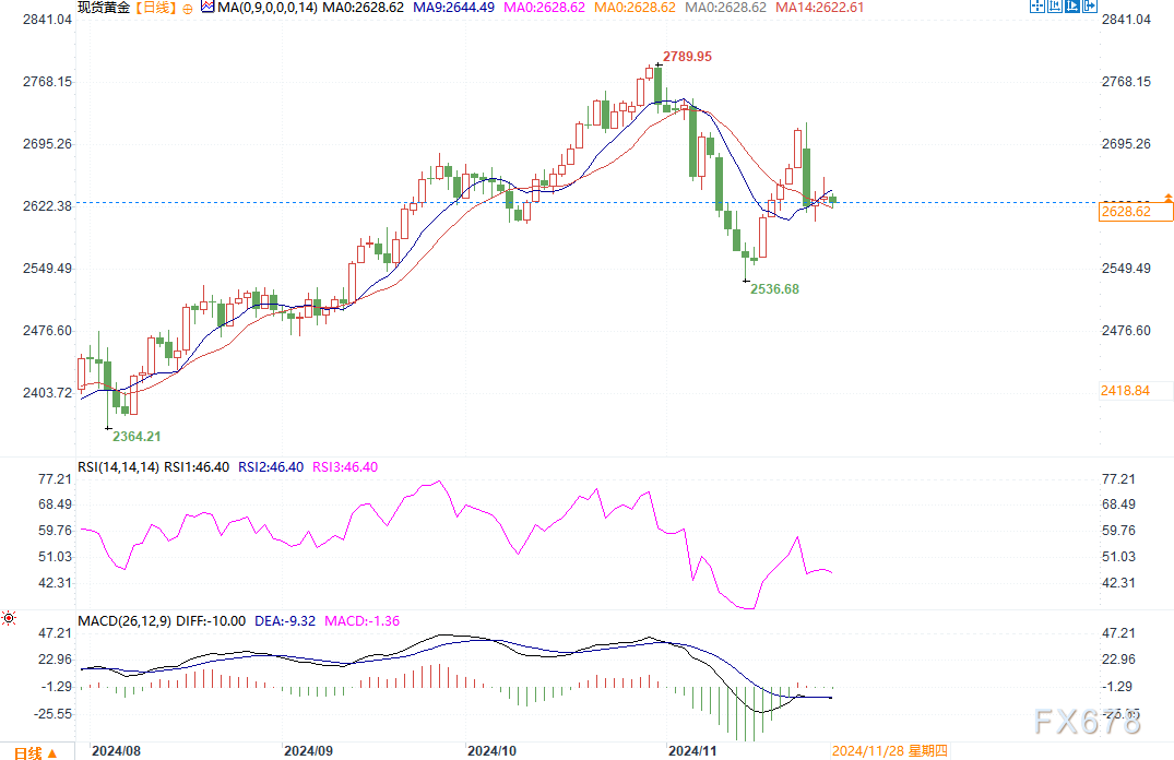 北京时间11月28日11:08,现货黄金价格报2627.60美元/盎司