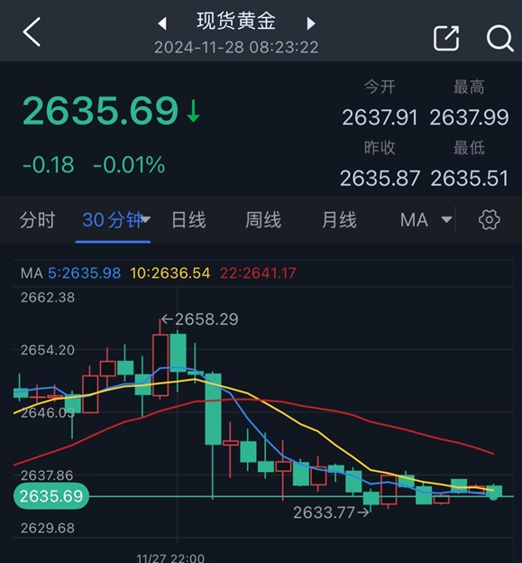 周三纽约早盘,金价一度触及2658.29美元/盎司,为日内最高水平。但随后金价出现大幅下滑,最低跌至2633.77美元/盎司。