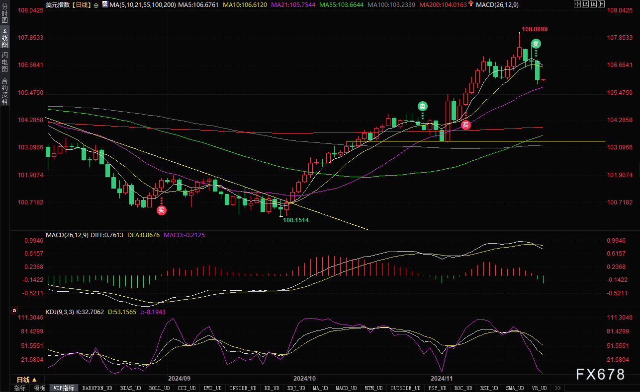美元指数周三下跌0.77%,为近三周最大单日跌幅,收报106.06,盘中最低曾触及105.85,为近两周新低。