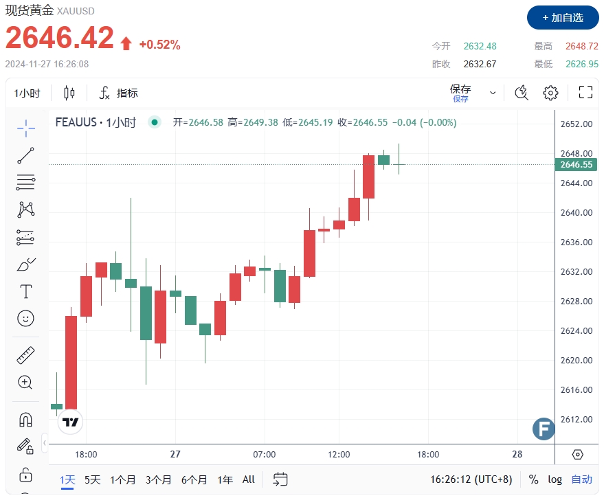 24K99讯 周三(11月27日)欧市早盘,黄金价格升至2646美元,金价内飙涨超过20美元,最高触及2648美元。俄乌地缘紧张局势支撑贵金属,《华尔街日报》(WSJ)报道,美国空军基地惊现神秘无人机,英国军方部署60名人员协防,俄罗斯指控英国外交官从事间谍活动而将其驱逐。