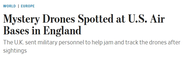 美媒提到,美国英格兰空军基地发现神秘无人机,它们于11月20日首次被发现,当地时间周一晚间再次被发现。英国官员表示,目前尚不清楚是谁在操控无人机,但无人机的出现被视为可疑。