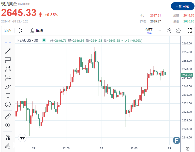 截至发稿,现货黄金上涨 0.35% 至每盎司 2,645.33 美元。本周一,黄金价格创下五个多月以来的最大单日跌幅。