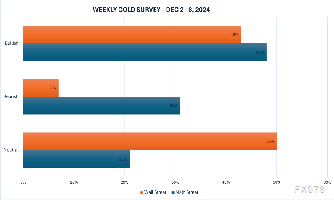 调查中,共有14位分析师参与调查,其中6位(占比43%)预计黄金价格将在未来一周上涨,7位(占比50%)预测黄金将进一步盘整,仅有1位(占比7%)预计黄金价格将下跌。在线调查中,199名参与者中,96名(占比48%)预计黄金价格将上涨,61名(占比31%)预计下跌,其余42名(占比21%)预计黄金将横盘整理。