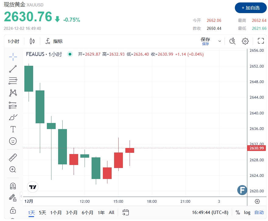 24K99讯 周一(12月2日)欧市早盘,黄金价格微幅反弹至2630美元,但仍维持着疲软姿态。技术分析警告,金价下行压力可能持续。俄乌紧张局势有所缓解,乌克兰总统泽伦斯基表态接纳以不包括俄占区版图加入北约,并换取俄乌热战停火,这与之前立场截然不同。