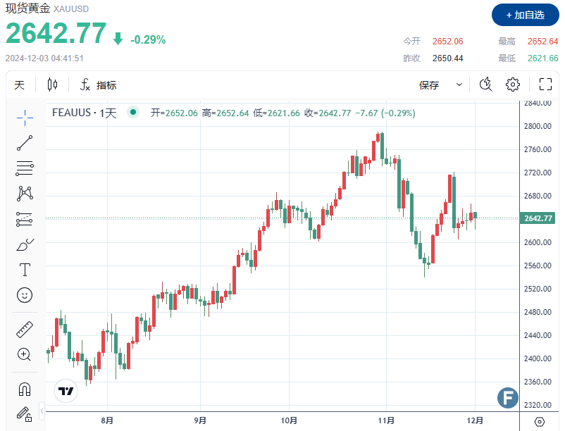 截至发稿,现货金下跌 0.29% 至每盎司 2,642.77 美元,当日早些时候一度较日高下跌近 30美元。