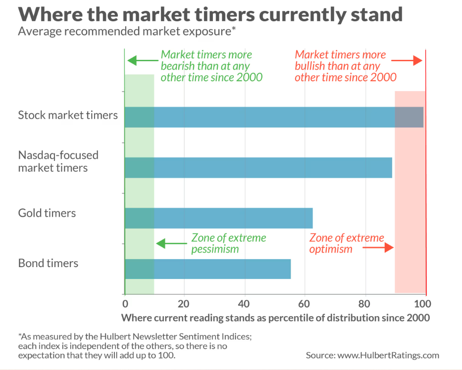 首先,来看一组短期股票时机把握者的平均建议股票敞口水平。(这一平均值由Hulbert股票通讯情绪指数(HSNSI)报告)。当前这一平均值高于2000年以来99.9%的日子。