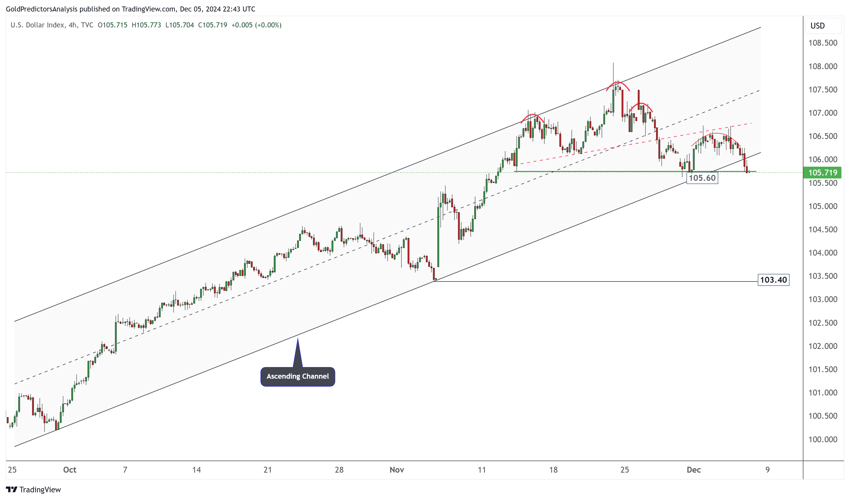 美元指数的4小时图显示,该指数在上升通道内交易。该指数还在通道阻力位附近形成了强烈的看跌形态。在从105.60支撑位短暂反弹后,该指数试图跌破该水平。