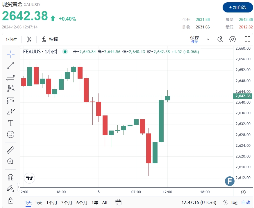 24K99讯 周五(12月6日),黄金价格短线冲高至2642美元,日内涨幅逾30美元。韩国可能再次宣布戒严,反对党将召开紧急会议,大批抗议者聚集在韩国议会外。非农就业报告(NFP)公布前,黄金行情剧烈波动,美国国债收益率在1年期阻力线回调后仍然疲软。