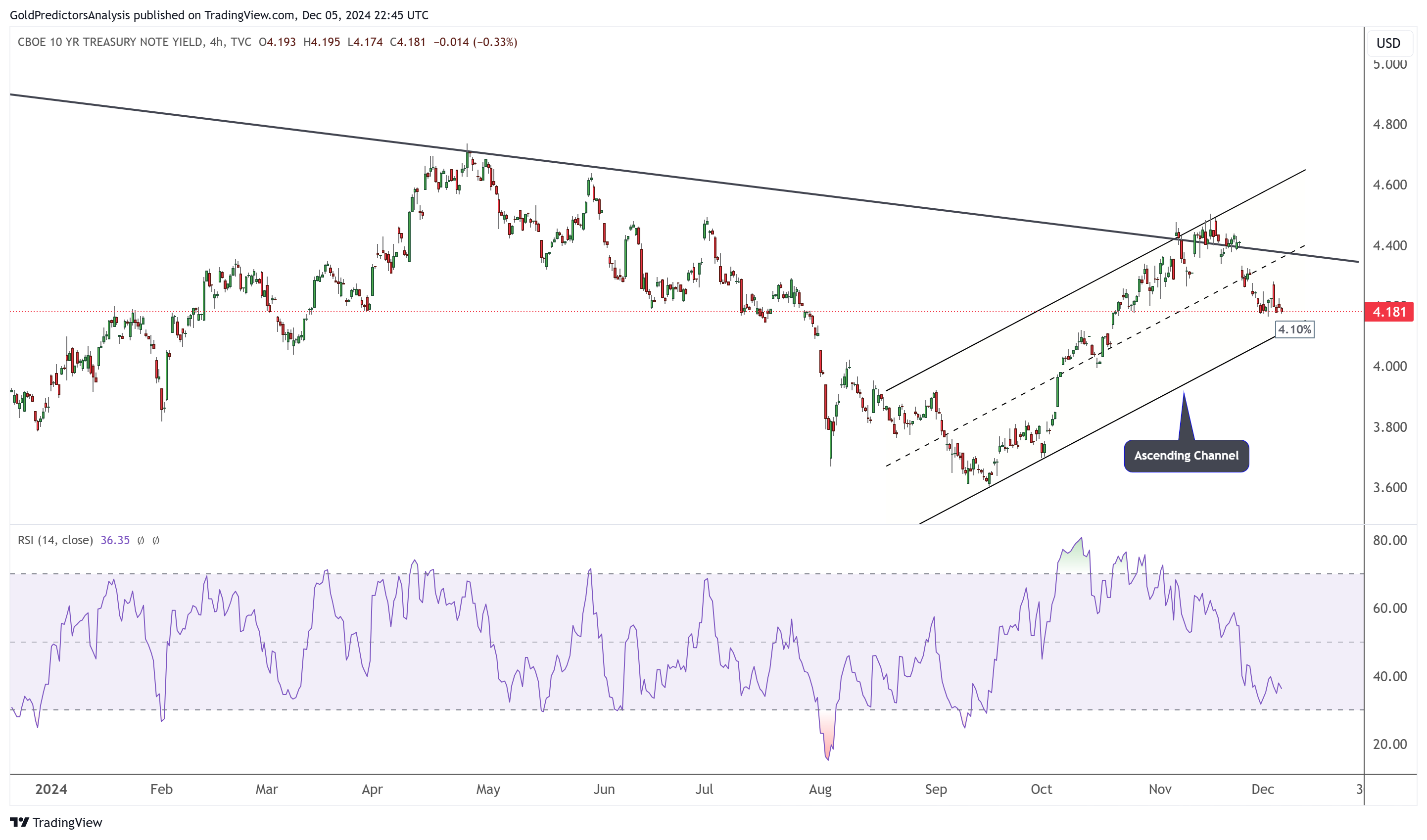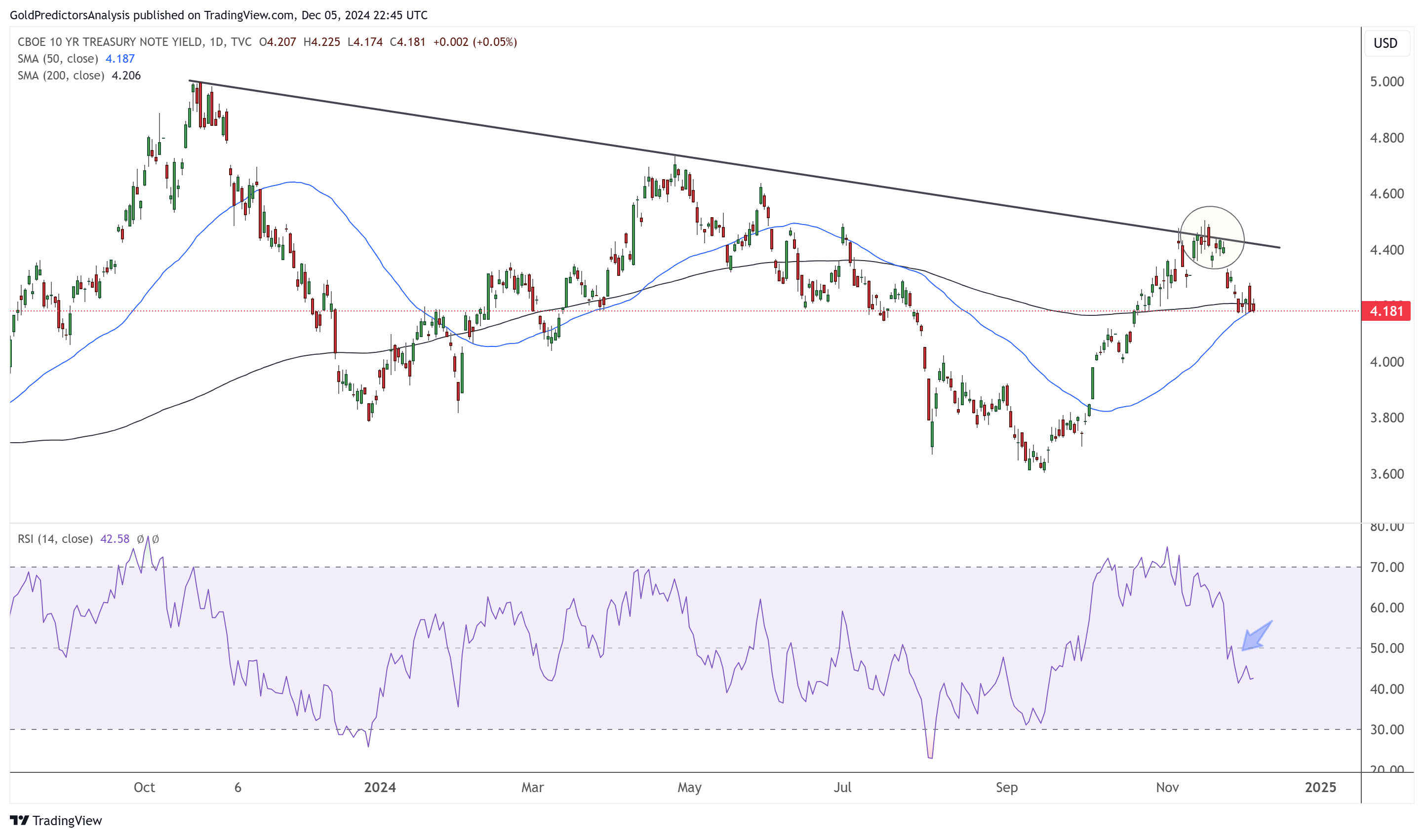 随着收益率接近该支撑位,RSI接近超卖水平。跌破4.10%可能会延续下行势头,随后可能会出现短暂反弹。