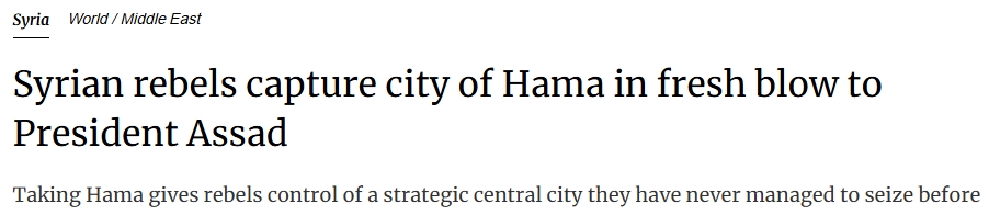 叙利亚反对派武装周四攻占了哈马市,这是一周前对叙利亚北部闪电式进攻的重大胜利,也是对叙利亚总统巴沙尔·阿萨德及其俄罗斯和伊朗盟友的又一次毁灭性打击。
