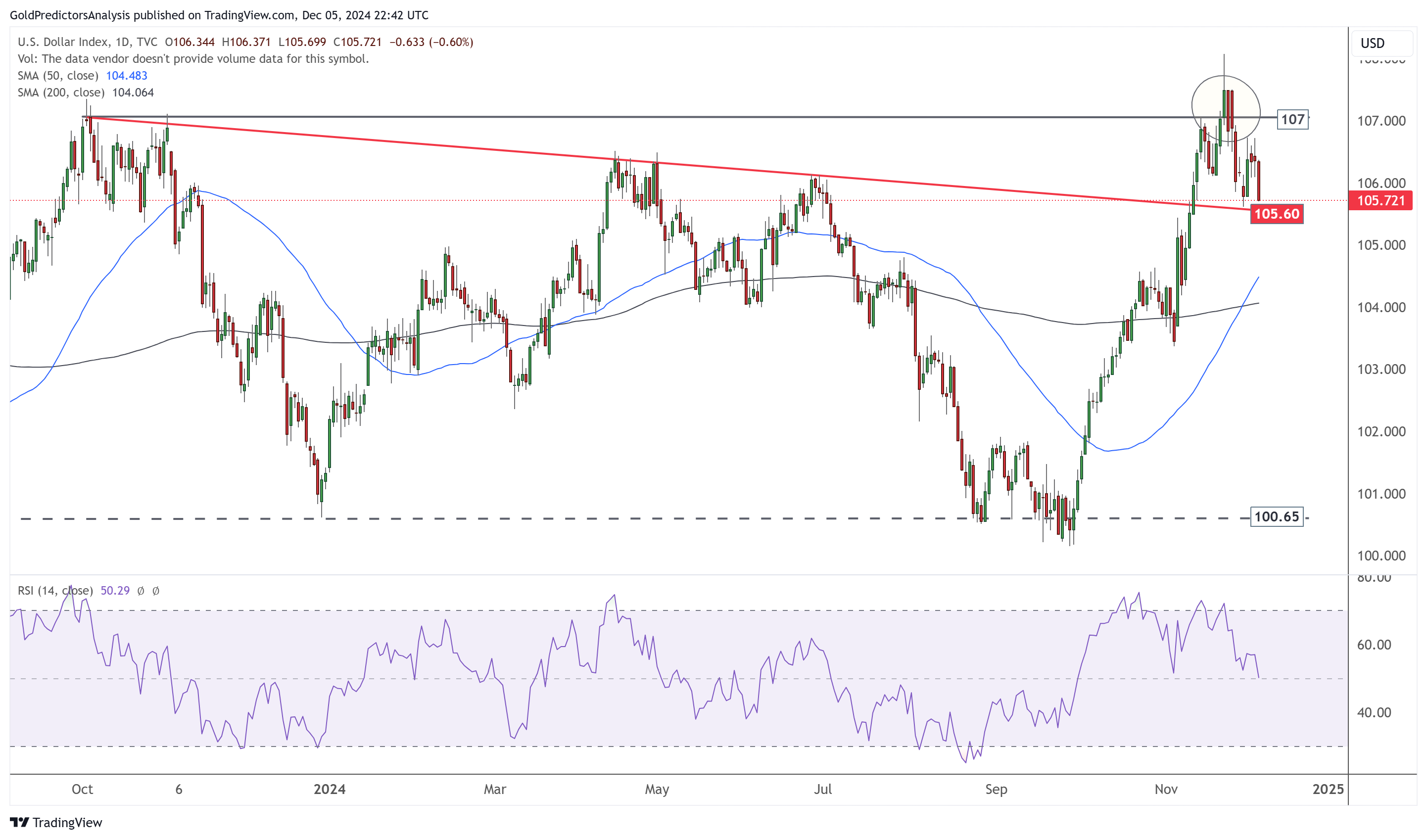 跌破105.60可能会加速美元指数的下跌势头。如果跌破该水平,RSI将跌至中点以下,预示可能下跌。