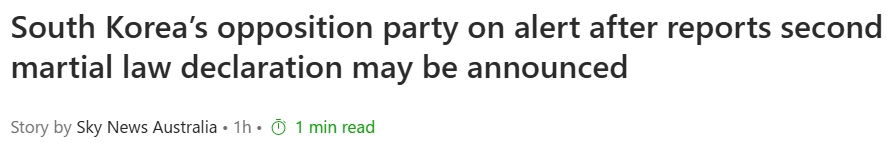 据澳大利亚天空新闻(Australia Sky News)引述当地媒体报道,韩国可能再次宣布戒严,韩国主要反对党处于警惕状态。