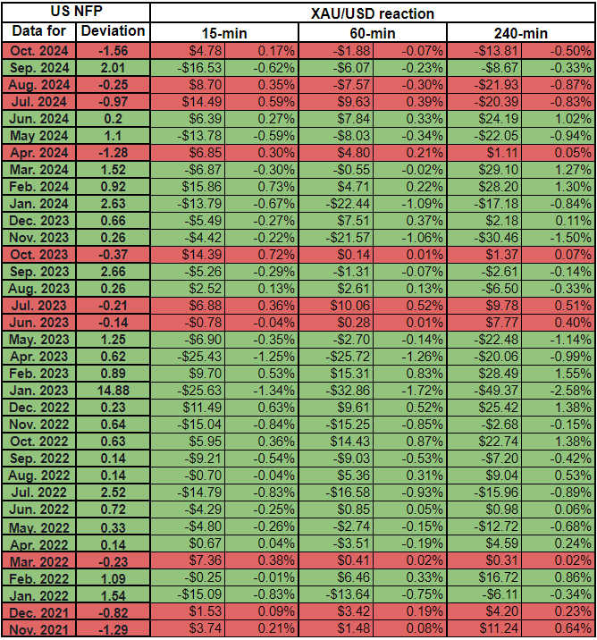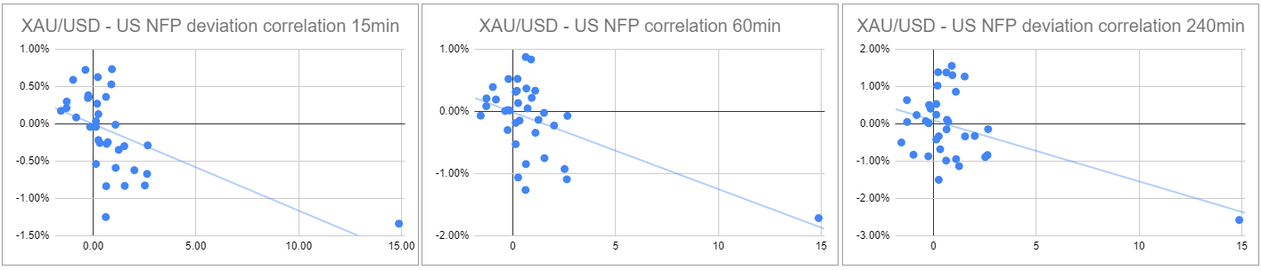 我们绘制了非农数据发布后的15分钟、1小时和4小时内的黄金价格反应。然后,我们将黄金价格的反应与实际非农结果与预期结果之间的偏差进行比较。