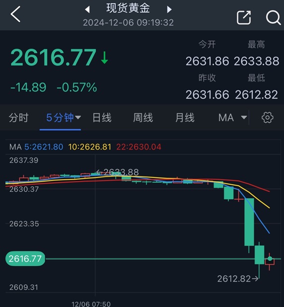 北京时间09:19,现货黄金报2616.77美元/盎司。