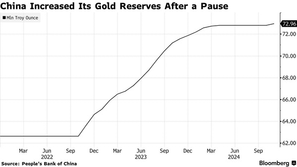12月7日,中国央行最新数据显示,2024年11月末中国黄金储备为7296万盎司,10月末为7280万盎司。