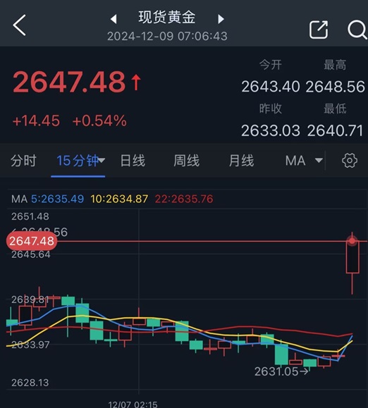24K99讯 周一(12月9日)亚洲交易时段开始后,现货黄金跳空高开10美元,随后金价进一步上涨,目前最高2648.56美元/盎司,日内大涨15美元。